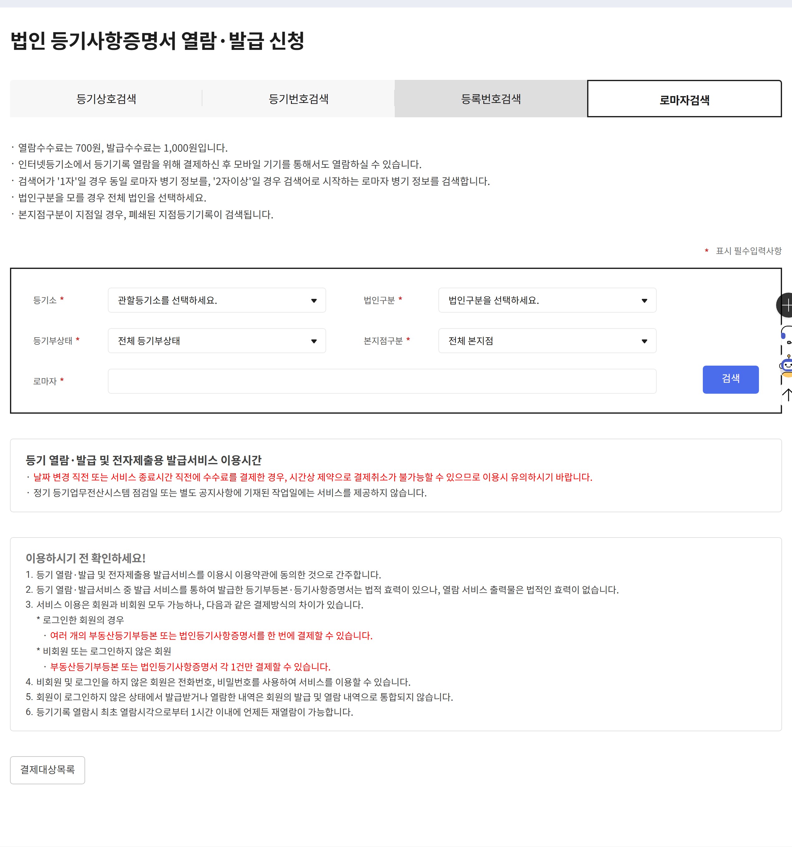 인터넷등기소 홈페이지 > 발급메뉴 > 등기사항전부증명서 > 법인 선택